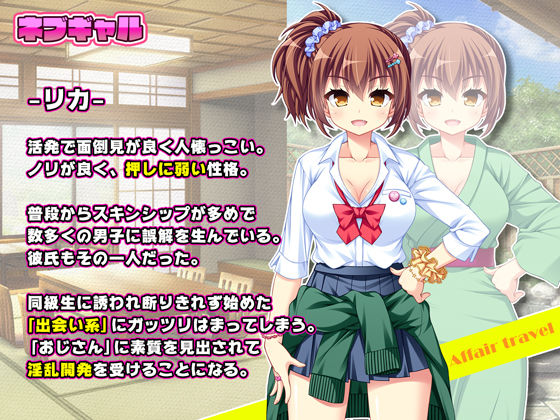 【概要】 出会い系で知り合った「おじさん」と寝取られ温泉旅行!【あらすじ】 不倫旅行に最適の寝取られ温泉旅館。 従業員も弁えた者ばかりのこの旅館は寝取り好きの間で愛用されていた。 今日もこの地で寝取った女に寝取られカミングアウトで仕上げを行うべく、 下卑た笑いを浮かべる男が訪ねてくる。今回のターゲットはクラスのアイドルで元気いっぱいのリカ。 期待…