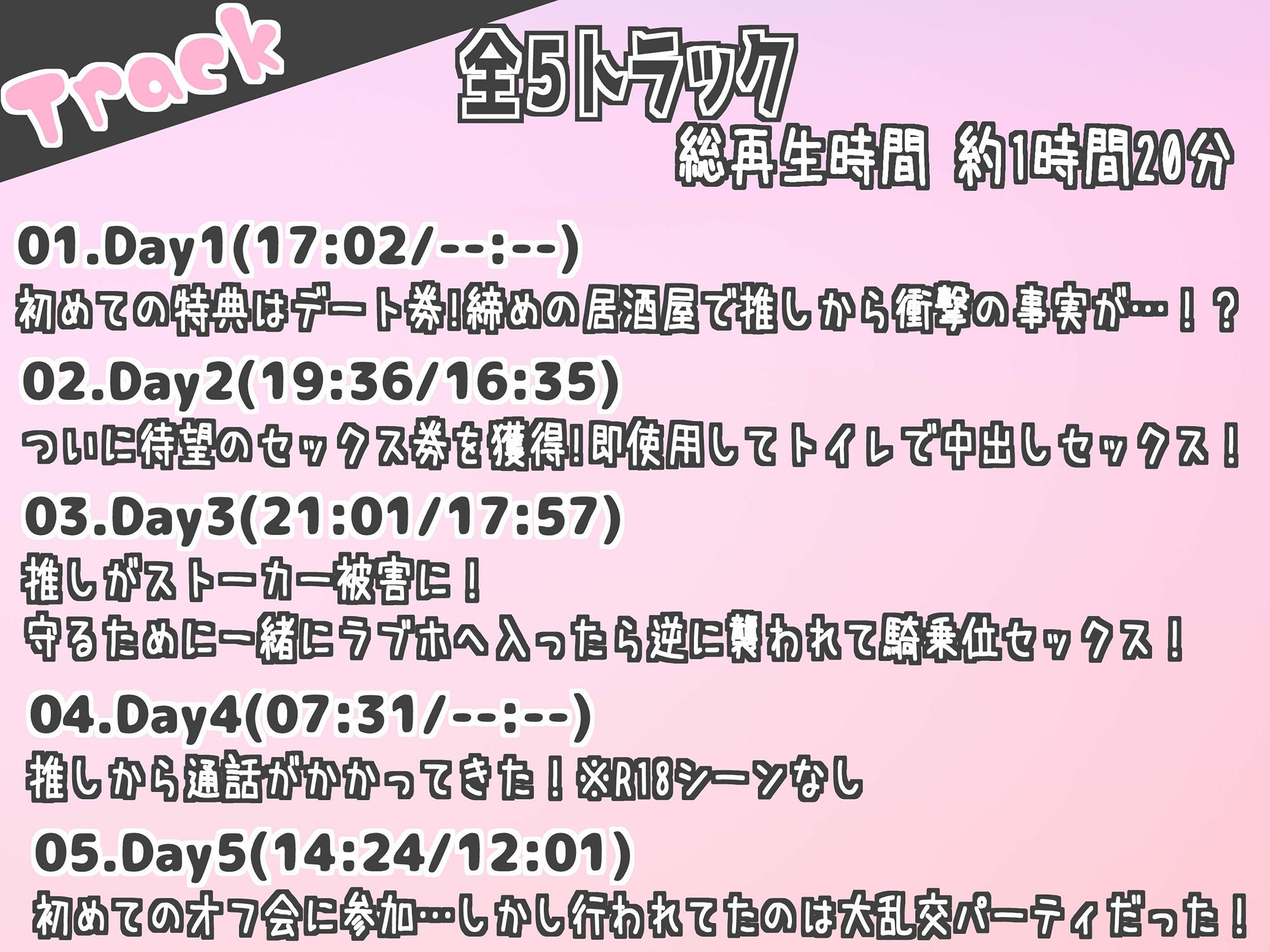 地下アイドルのモモに一目惚れして推し活しているあなた。 ようやくスタンプカードを貯めて獲得した特典はモモとの1日デート券!デートを満喫したあなたは推しの口から衝撃の事実を伝えられる…! 寝取られに近い新しい喪失感を味わってみてください。[トラック(再生時間/絶頂タイミング)] ■Track01_Day01 初めての特典はデート券!締めの居酒屋で推…