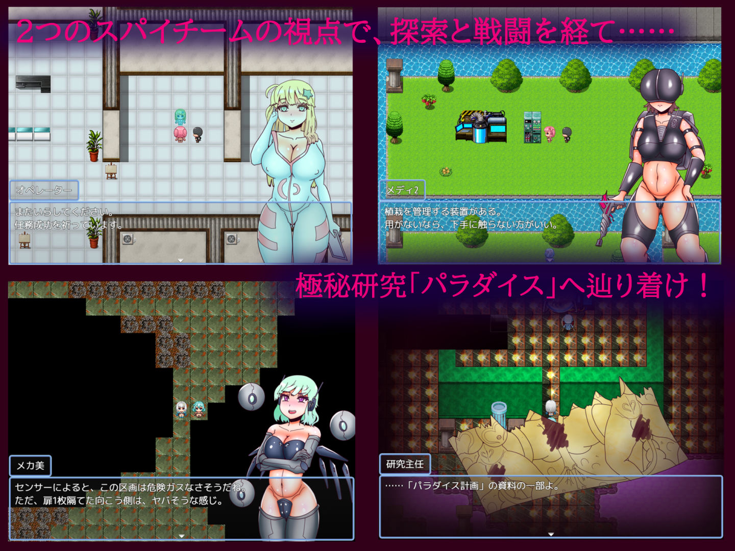 ●ゲームの概要〇ストーリー 異能力者が出現しだした近未来。 とある研究を巡り、2人のヒロインが怪しげな施設への潜入任務に就く。 罠を避け、時には立ちはだかる敵を薙ぎ倒し、異なるルートで施設の深部へと向かう2人は、 やがておぞましい真実を目の当たりにする……!〇ゲームの流れ 本作は探索RPG作品です。 マップを探索し、イベントを発生させ、物語を進めて…