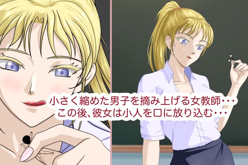 <ストーリー> 美しい金髪ポニーテールの女教師に恋心を抱く男子は、彼女からプレゼントされた縮小薬入りドリンクを飲み、体が〇さくなってしまう。女教師は慌てる男性をつまみ上げ、口の中に放り込み、丸のみにする。小人にされた男子は美女の体内を全身で味わう・・・<概要> サイズフェチ(縮小化・シュリンカー)×被食・Vore系のイラスト集で、口から肛門まで金髪ポニ…
