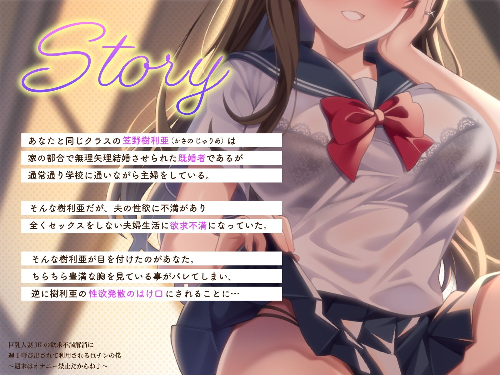★ストーリー★ あなたと同じクラスの笠野樹利亜(かさの じゅりあ)は 家の都合で無理矢理結婚させられた既婚者であるが 通常通り学校に通いながら主婦をしている。そんな樹利亜だが、夫の性欲に不満があり 全くセックスをせずに欲求不満。そんな樹利亜が目を付けたのがあなただった。 ちらちら豊満な胸を見ている事がバレてしまい 逆に樹利亜の性欲発散のはけぐちに…